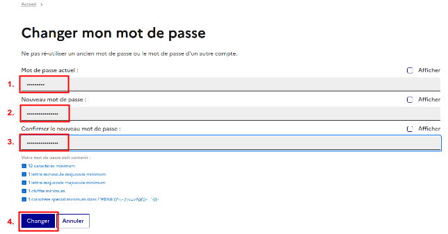 - Entrer votre mot de passe actuel en 1.