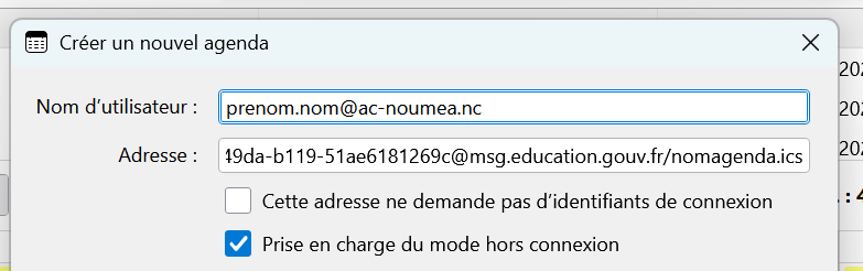 Remarques : pour un agenda partagé depuis une adresse fonctionnelle il faut que celui qui partage cet agenda vous donne le lien "ICS" du style : "http://messagerie.education.gouv.fr/home/379ce621-f5bc-49da-b119-51ae6181269c@msg.education.gouv.fr/nomagenda.ics"