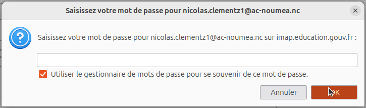 - Après redémarrage de Thunderbird, l’application demande de renseigner le mot de passe. Renseigner le mot de passe avec celui obtenu précédemment.