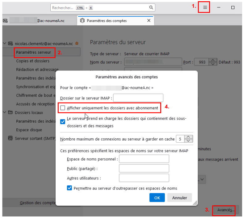 Afin que Thunderbird affiche l’ensemble des boites fonctionnelles associées au compte nominatif, il convient de réaliser un paramétrage complémentaire :