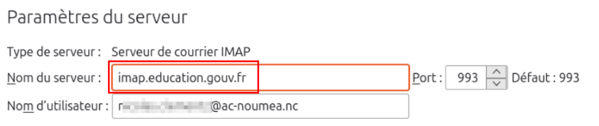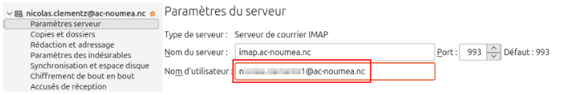 - Dans les paramètres serveur du compte, changer le nom d’utilisateur avec votre adresse email au format prénom.nom@ac-noumea.nc