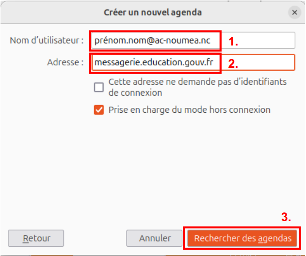 - Remplir le nom d’utilisateur avec notre adresse mail principale (prénom.nom@ac-noumea.nc) (1.)