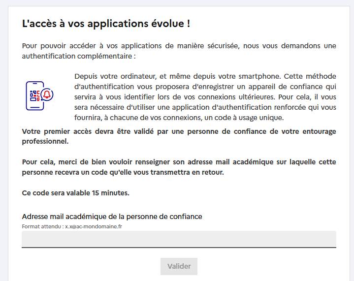 Lors de la première utilisation de l’authentification TOTP, l’utilisateur est renvoyé sur une page qui l’invite à communiquer l’adresse mail d’un tiers de confiance parmi les utilisateurs de l’académie.