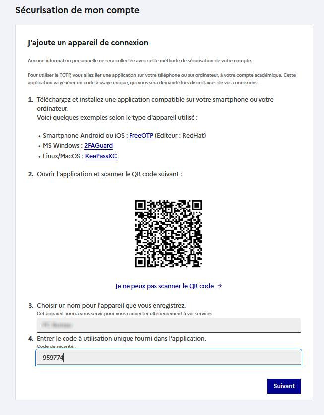 Une fois le code saisi, l’utilisateur verra une page lui permettant de configurer son application TOTP